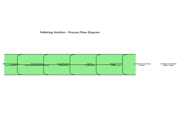 A Pelleting Solution is an advanced technology for converting Refuse Derived Fuel (RDF) fluff, agro-residues, or biomass waste into dense, uniform pellets that serve as an alternative clean fuel for cement plants, boilers, gasifiers, and waste-to-energy facilities.